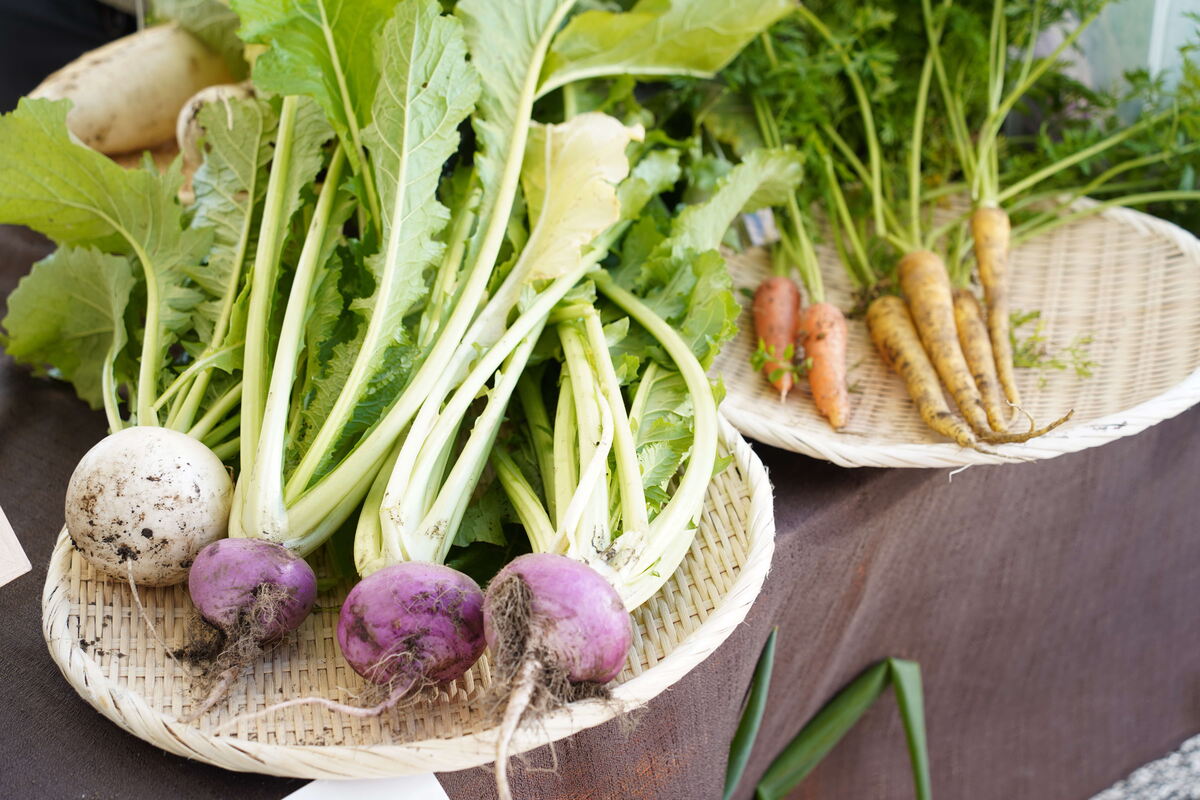 店頭には採れたての土付き有機野菜たちや果物、からだに優しい調味料や雑貨、アート作品が並びました。
