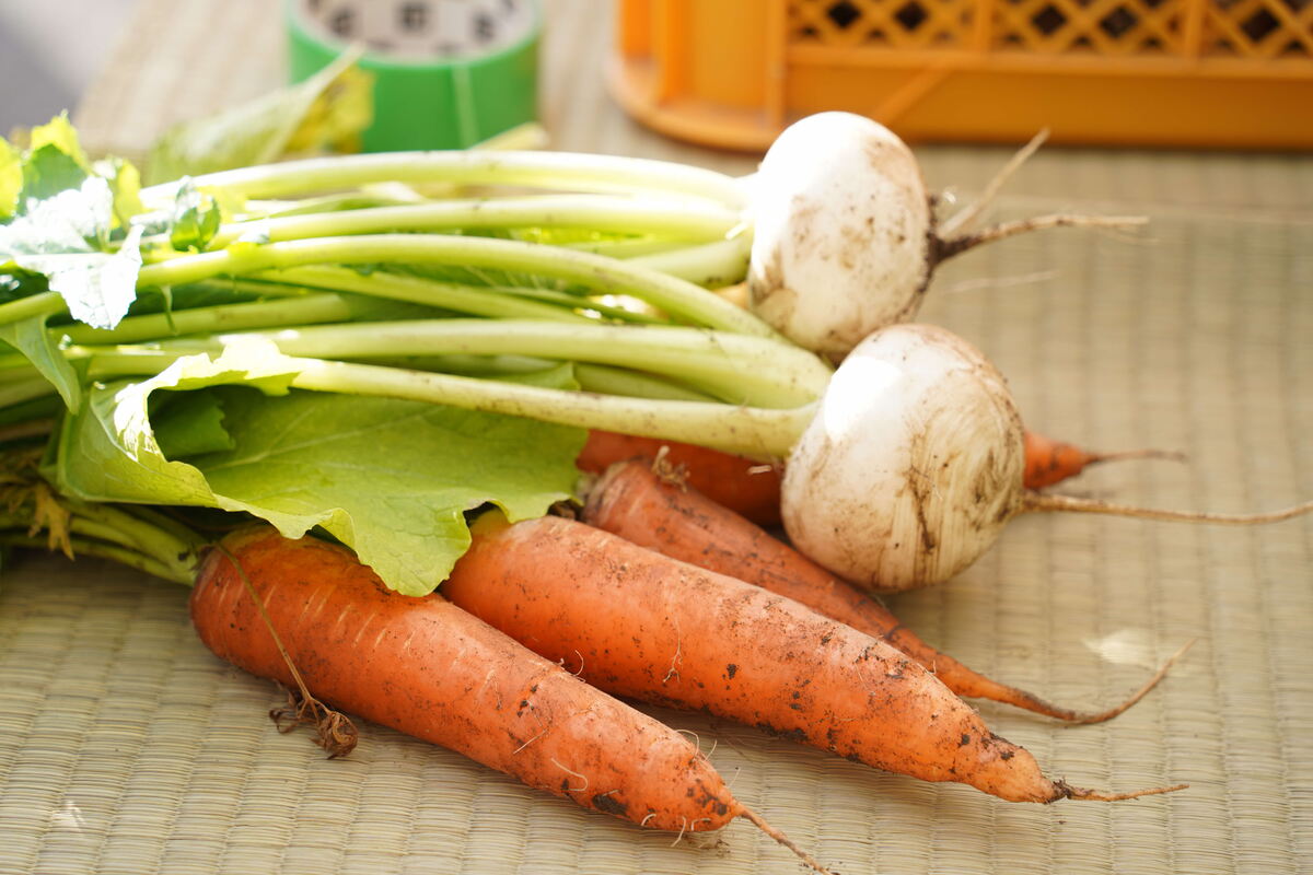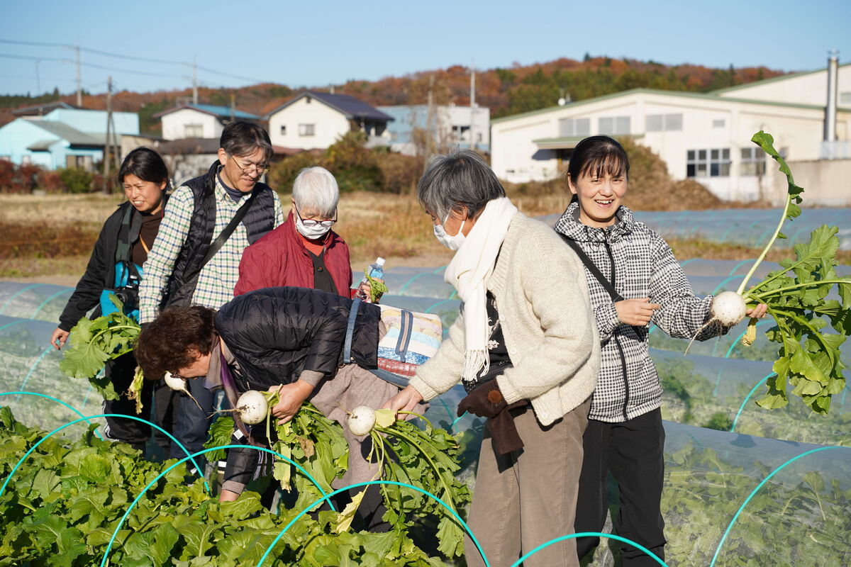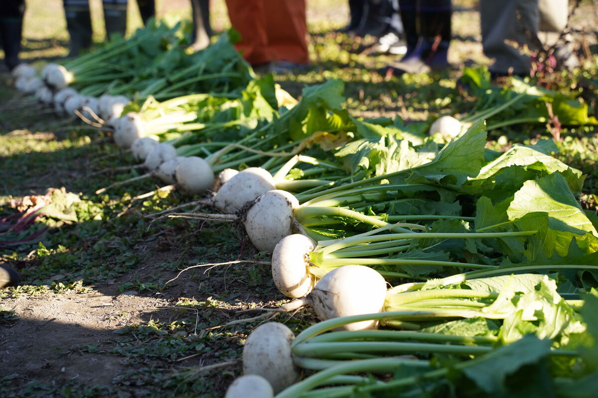 「みやま小かぶ」という品種のカブを皆で収穫し、形の良いものを選別しました。