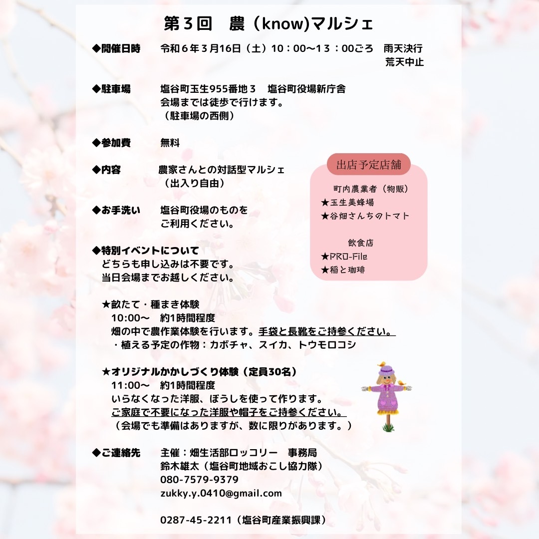 3月16日、塩谷町役場横の空き地にて第3回農(konw)マルシェが開催されました。