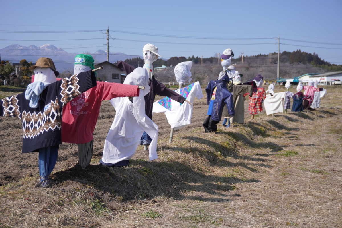 カボチャ、スイカ、トウモロコシの種を子供たちとまき、畑にはユニークなかかしが並びました。