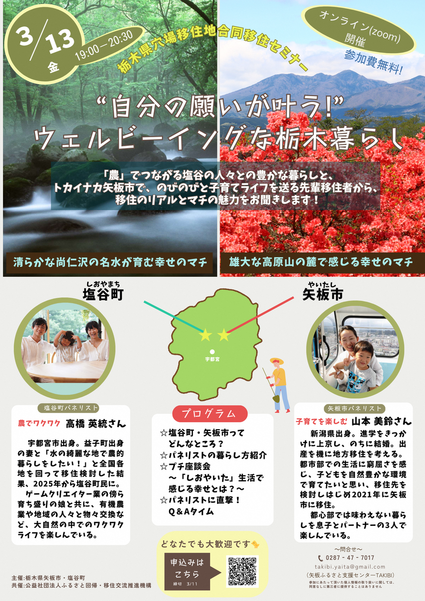 【3/13(金)「栃木県穴場移住地(塩谷町・矢板市)合同移住セミナー“自分の願いが叶う!”ウェルビーイングな栃木暮らし」を開催します】